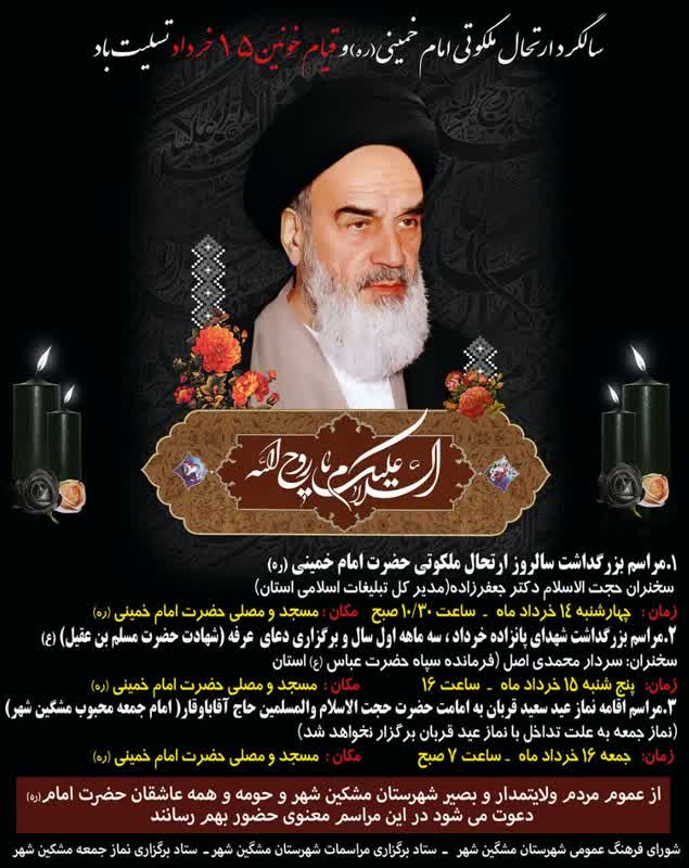 اطلاعیه برگزاری مراسمات ایام سالگرد ارتحال حضرت امام راحل ،شهدای پانزده خرداد، سه ماهه اول سال و دعای عرفه ،اقامه نماز عید سعید قربان در مشگین شهر